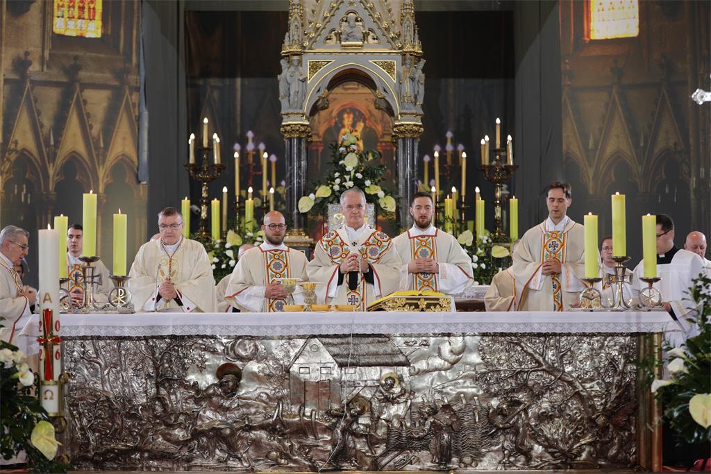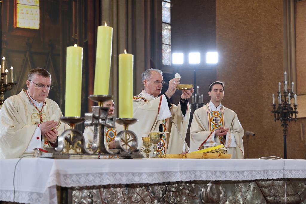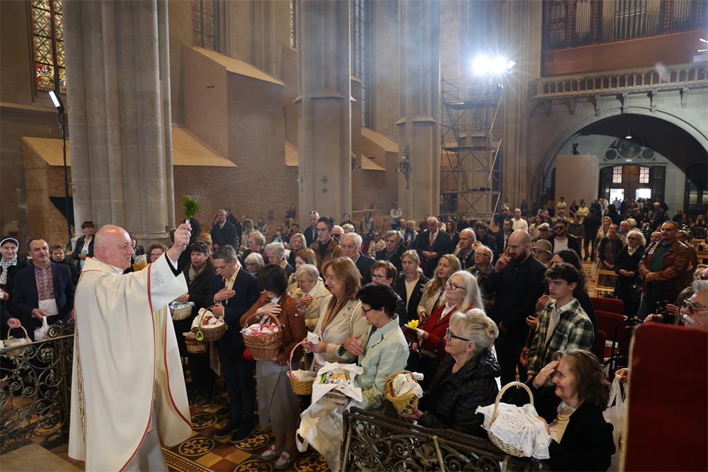 Zagrebački nadbiskup mons. Dražen Kutleša predvodio je na Nedjelju uskrsnuća Gospodnjega, 5. travnja 2026., svečano euharistijsko slavlje u Zagrebačkoj katedrali. Koncelebrirali su nadbiskup u miru kardinal Josip Bozanić, pomoćni biskup mons. Marko Kovač, kanonici Prvostolnog kaptola zagrebačkog, prebendari Prvostolne crkve zagrebačke i nadbiskupski tajnik vlč. Domagoj Topić.